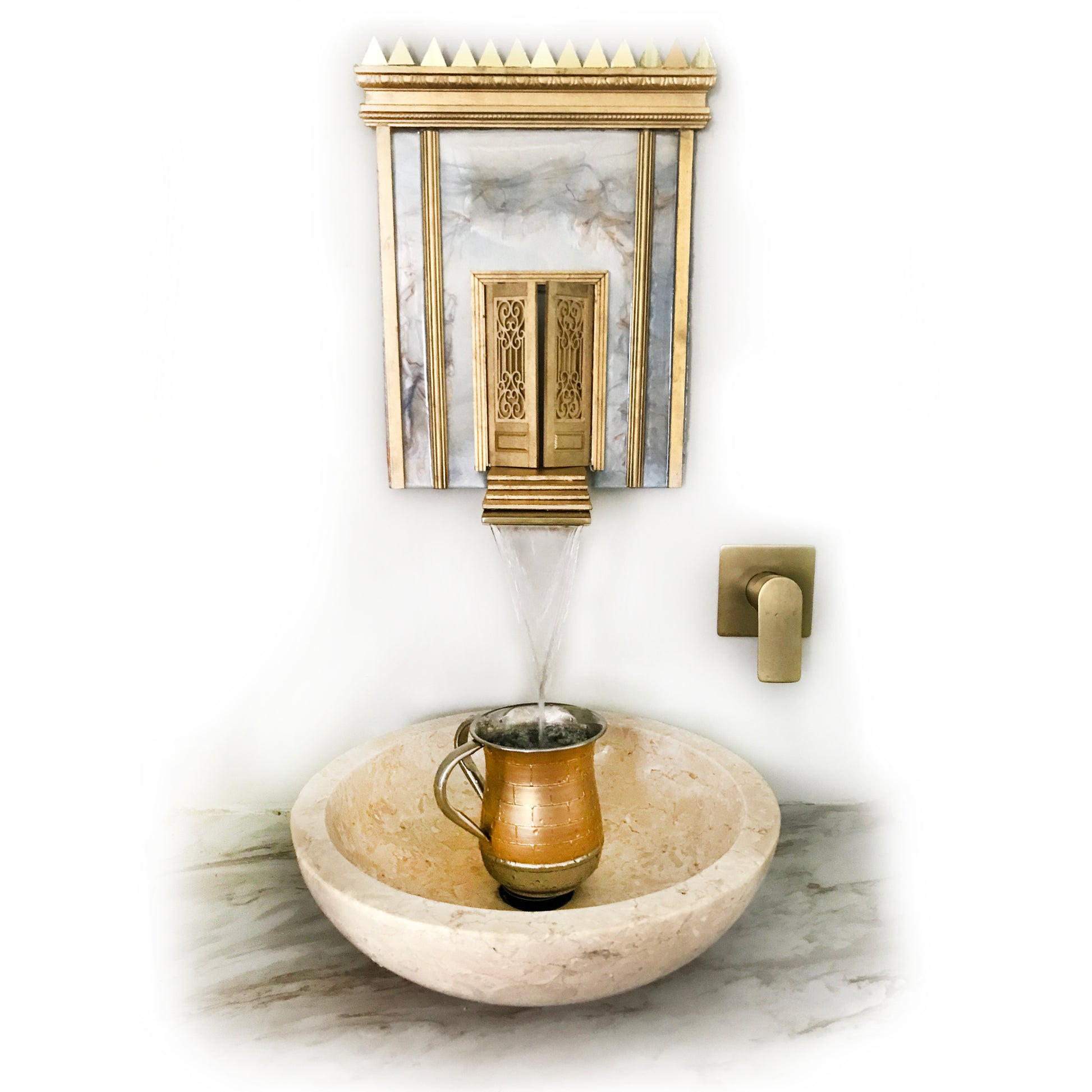 Welcome to our exclusive new line! Our hand-crafted faucet for your home or shul is absolutely breathtaking and inspiring. Our aspiration as a nation to serve Hashem in the Third Bais Hamikdash is unanimous and conjures deep emotion. Yechezkel 47:1 prophecises regarding the Third Bais Hamikdash that there will be a river flowing from the Kodesh Hakedashim. This sink was crafted to remind us constantly of our yearning to see it be built speedily in our days.