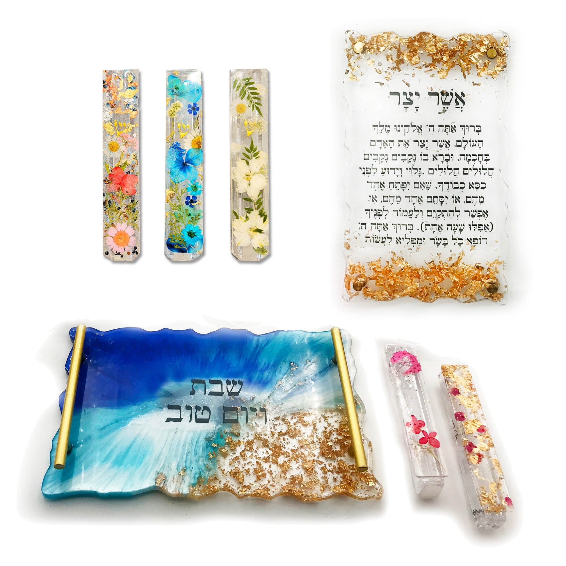 We provide all the materials necessary for you, your family, and/or your guests to make 5 beautiful mezuzah cases, a gorgeous challah tray, and Asher Yatzar sign.